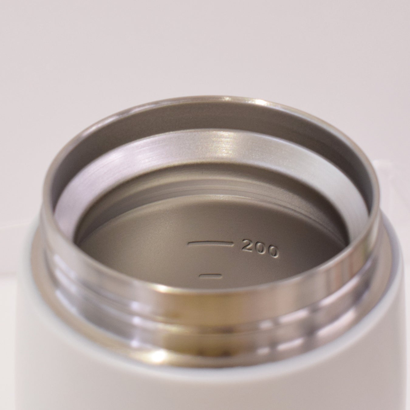 本体はステンレスの2層構造。味噌汁、スープなどを温かいまま持ち運ぶことができます。また保冷機能としても〇。冷製スープなども冷たさを保ちます。湯量・水量の目安が分かる目盛り付き。インスタントスープを作るときに便利です。本体のフチの端はなめらかになっています。そのまま飲む際にも優しい口当たりです。