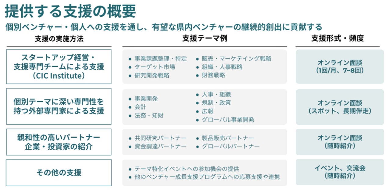 本プログラムの採択企業には、メンタリング、マッチング、セミナーなど、CICの有する国内外のネットワークや千葉県内の支援機関のリソースを活用し、採択企業のニーズに合わせたテーラーメイドの支援が提供されます。