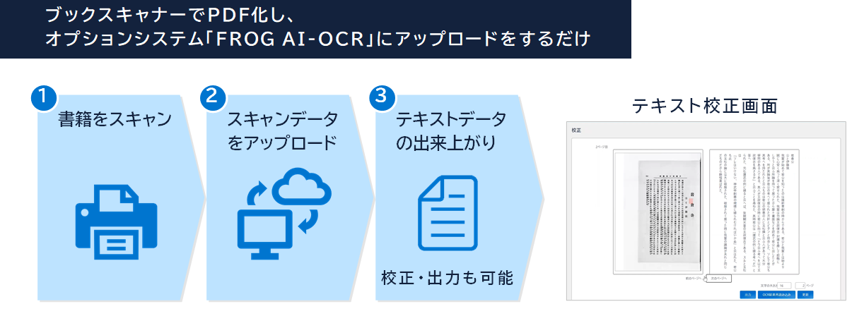 今回は両社の強みを生かし、ブックスキャナー利用者に対して、スキャン後に「FROG AI-OCR」を利用できるオプションサービスを開始しました。これにより、書籍などをスキャンして電子画像化するだけではなく、AI-OCR機能ですべての文書をテキストデータ化、透明テキスト付PDF化、旧字旧仮名文字の変換、検索性の向上などが実現しました。