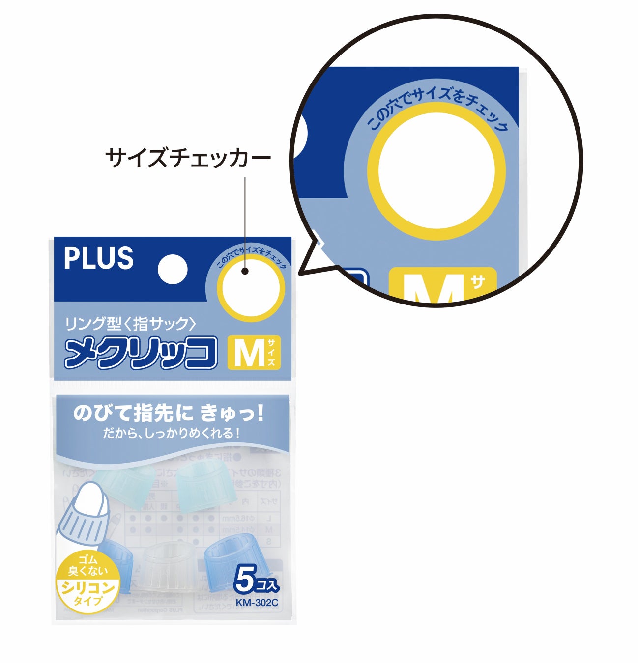パッケージは、各サイズの内径寸法に合わせた円形のサイズチェッカー付き。手軽に自分の指に合うサイズを選べます。