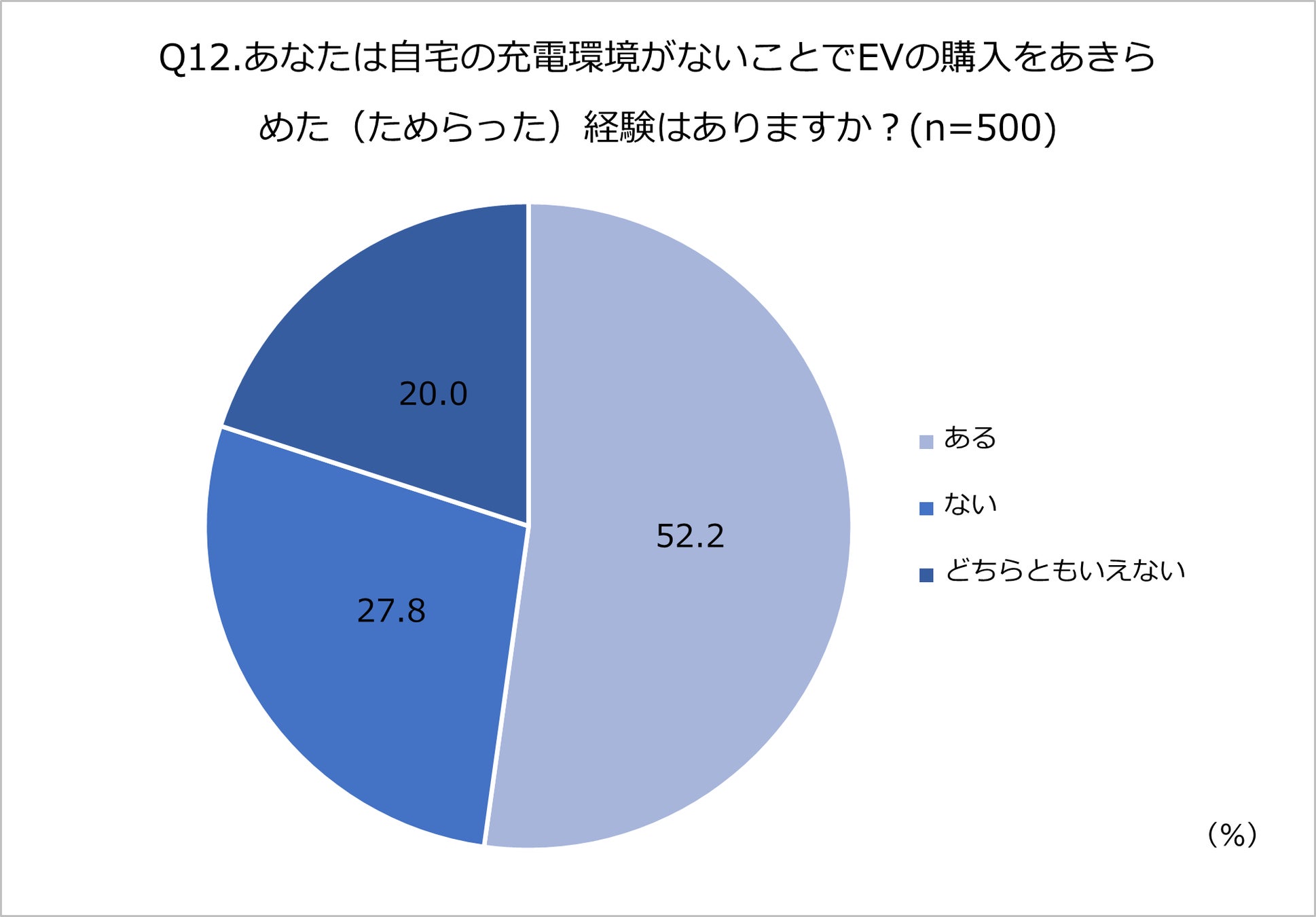 購入の意向が高まる一方で、EVの保有を諦めた人も。その理由を探るため「自宅の充電環境が整っていないため、EVの購入を諦めた(ためらった)経験があるか」を聞いたところ、「ある」と回答した人は52.2%と半数に上ります。このことからも、充電環境の整備がEV購入意向を高める重要な要素であることがわかりました。