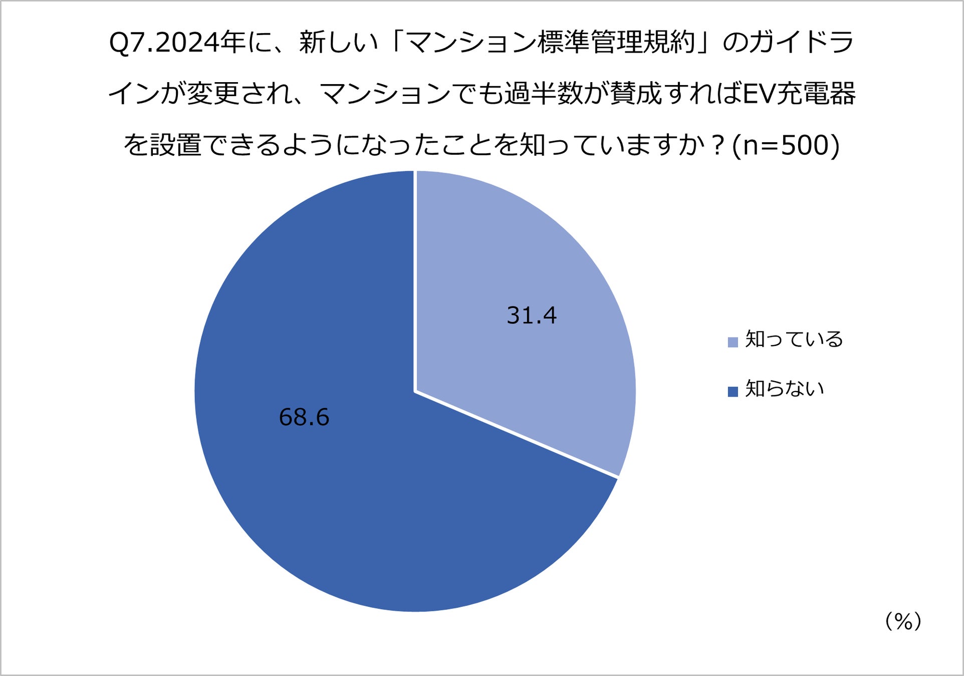 さらに、2024年には「マンション標準管理規約」のガイドラインが変更され、これまで4分の3以上の住民の賛成が必要だったEV充電設備の設置が、過半数の賛成で可能になりました。しかし、この変更を知っているかを尋ねたところ、68.6%が「知らない」と回答。上記の結果から、“自宅充電”が進むことでEV普及の一助になる一方、設置や補助金・住環境の制度の周知不足が課題であることが浮き彫りとなりました。