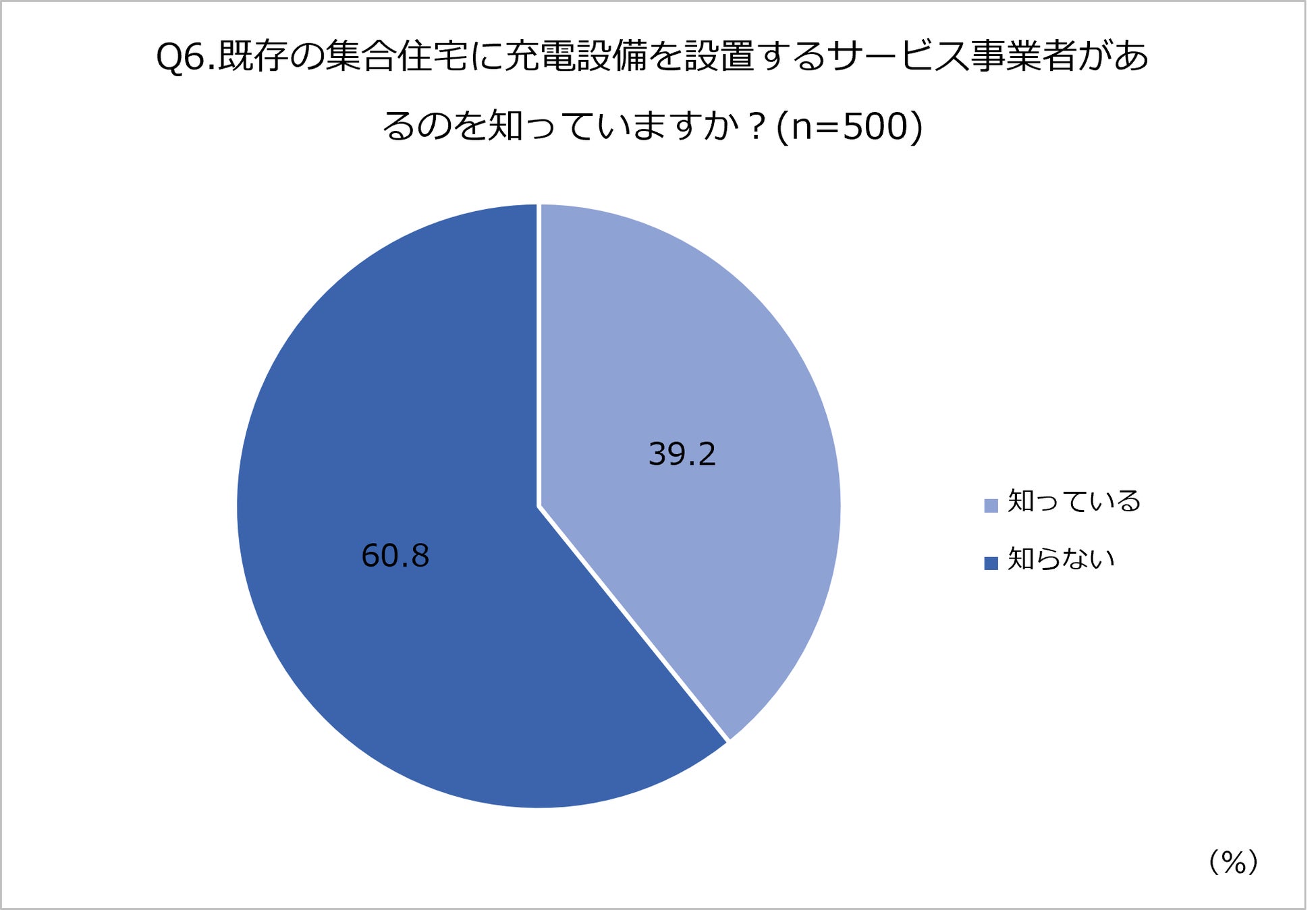 「既存の集合住宅に充電設備を設置するサービス事業者があるのを知っていますか?」という質問でも、60.8%「知らない」と回答しており、EV充電インフラの整備に関する認知度が依然として低いことが明らかになりました。