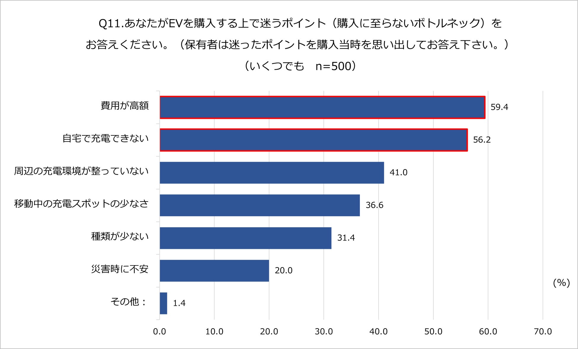 一方で、購入の際のボトルネックは「費用が高額」の59.4%に続き、「自宅で充電できない」が56.2%