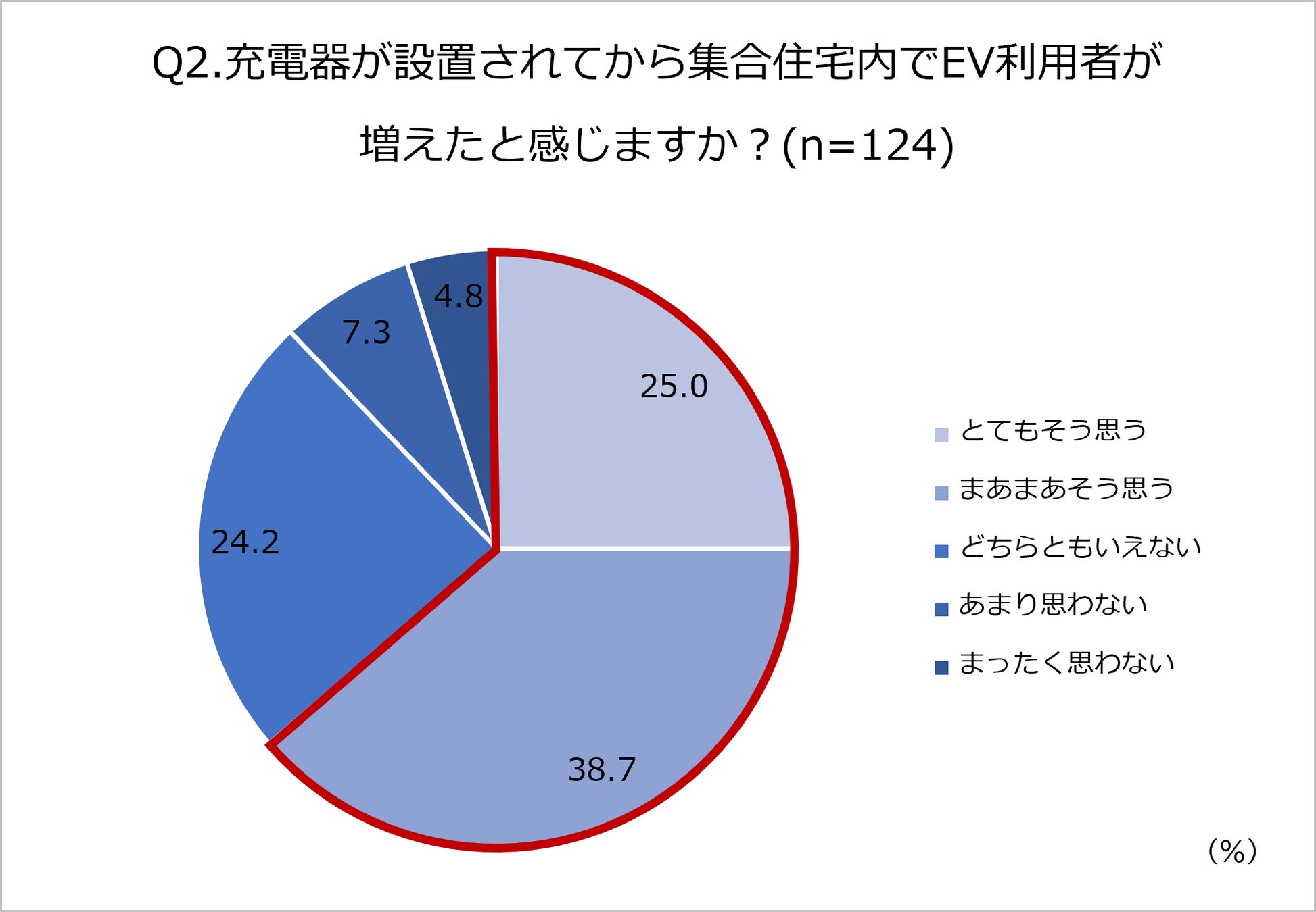 「集合住宅でも自宅にEV充電器が設置されることでEVの購入意向が高まると感じるか」という質問に、「とてもそう思う(23.0%)」、「まあまあそう思う(51.4%)」と回答した人は74.4%に上りました。この結果からも、自宅の充電環境が整うことが、EV購入意欲を高める重要な要素であることがうかがえます。 実際に、「集合住宅に充電器が設置されてから、EV利用者が増えたと感じますか」という質問では、63.7%が「とてもそう思う(25.0%)」、「まあまあそう思う(38.7%)」と回答しており、EVの浸透のためには身近な充電環境の整備が不可欠であることが示されています。