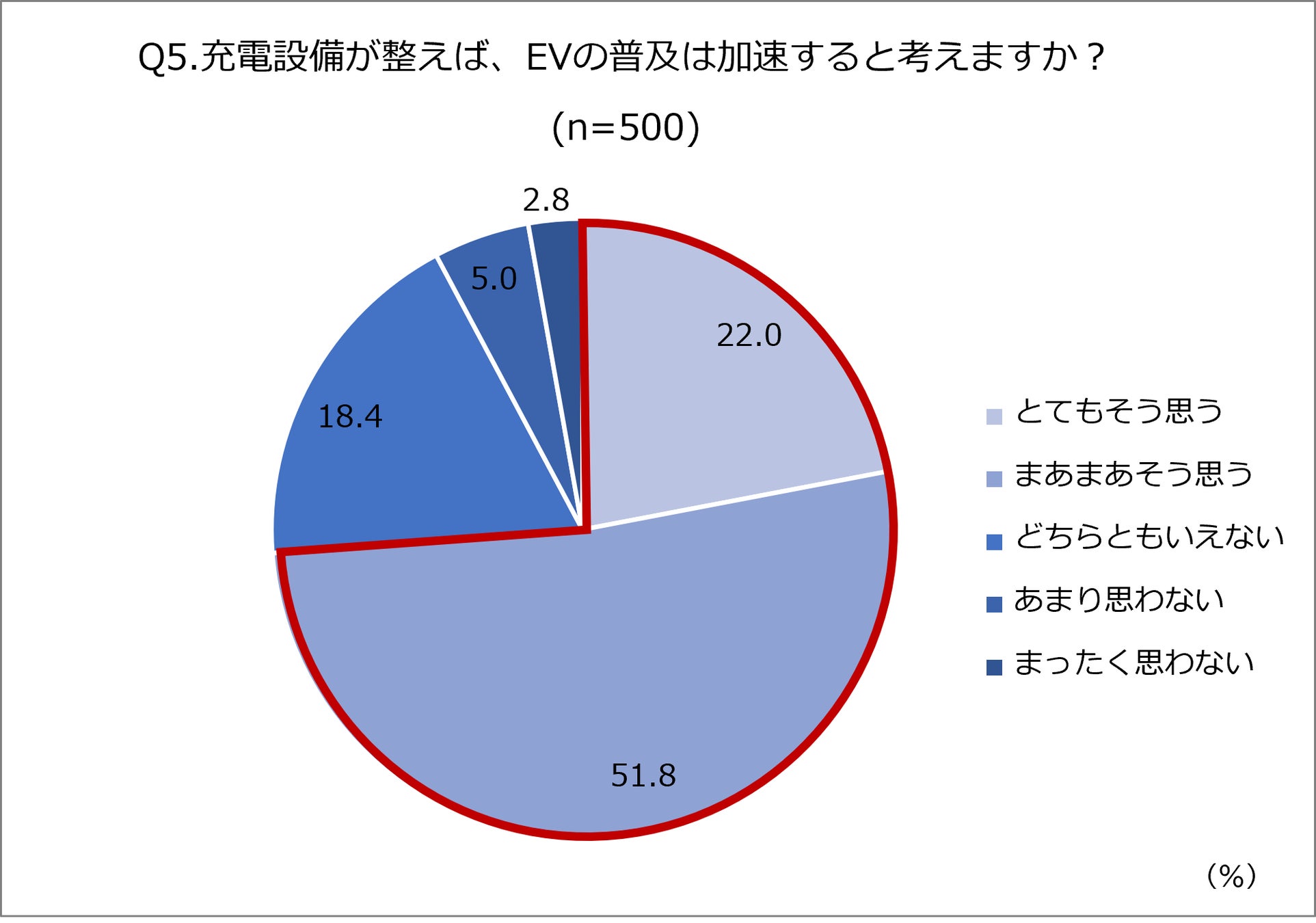 また、「充電設備が整えば、EVの普及は加速すると考えますか」という質問では、73.8%が「とてもそう思う(22.0%)」、「まあまあそう思う(51.8%)」と回答しており、充電インフラの整備がEV普及の重要な要素であることがうかがえます。