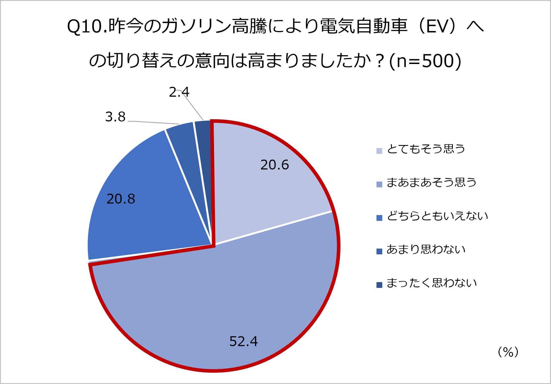 また、「昨今のガソリン高騰により、EVへの切り替え意向は高まりましたか」という質問に対しても、実に73.0%の人が「とてもそう思う(20.6%)」、「まあまあそう思う(52.4%)」と回答しました。これにより、昨今のガソリン価格の高騰がEV購入検討に影響を与えていることがうかがえます。
