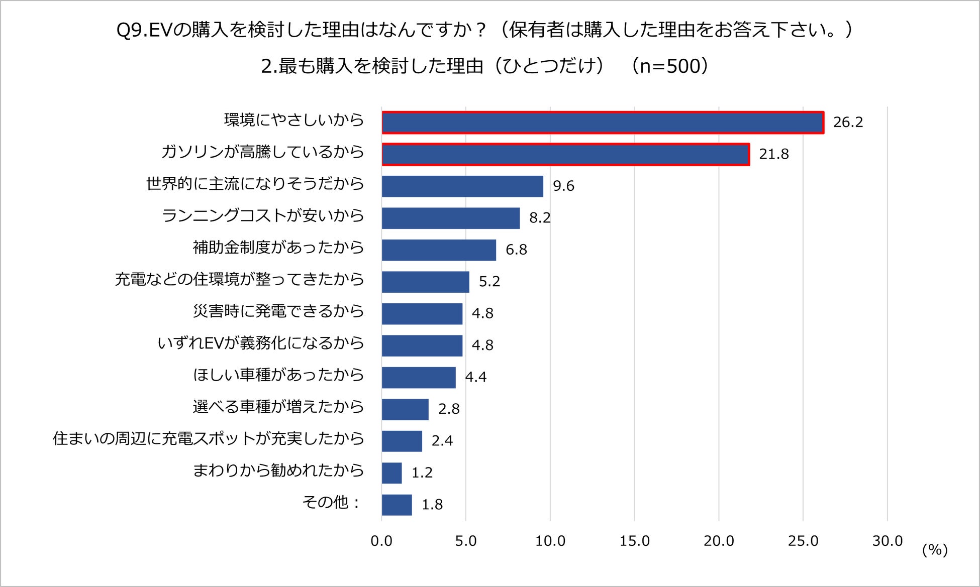 EVの検討者・保有者を対象に、EVを検討する理由を尋ねたところ、「環境にやさしいから(26.2%)」が最も多く、次いで「ガソリン価格の高騰(21.8%)」があげられました。