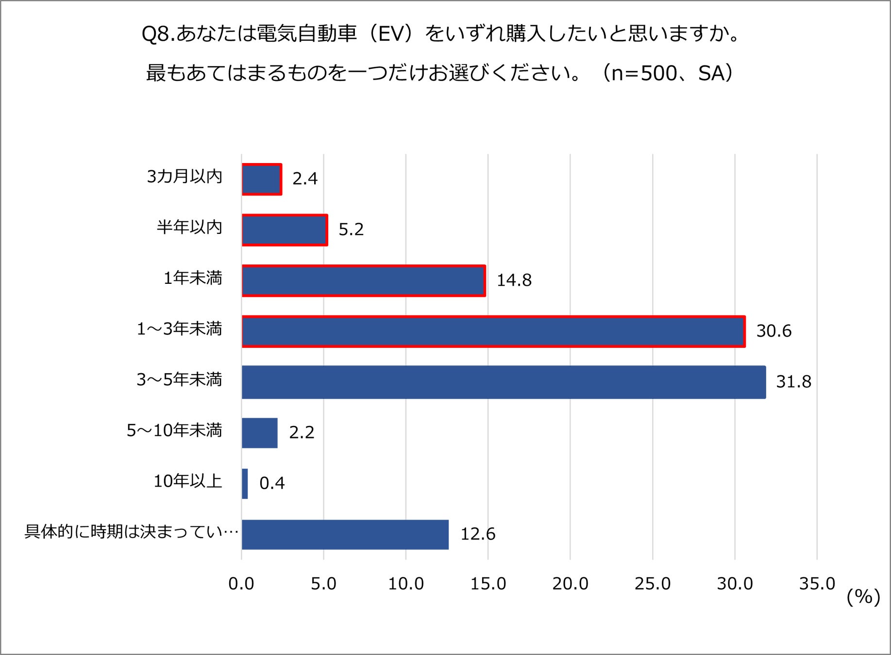 ■EVを保有したいと考える人のうち、半数が『3年未満に購入を検討している』と回答。