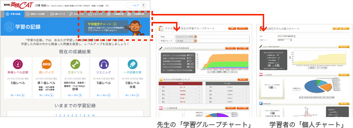 『旺文社・英検® CAT』は、「個人チャート」と先生向けの「学習グループチャート」の2つの管理機能を搭載しています。学習者は「個人チャート」で自分のこれまでの学習履歴やグループ平均との比較を確認でき、自分の英語力がどれくらい向上したかが一目で分かります。