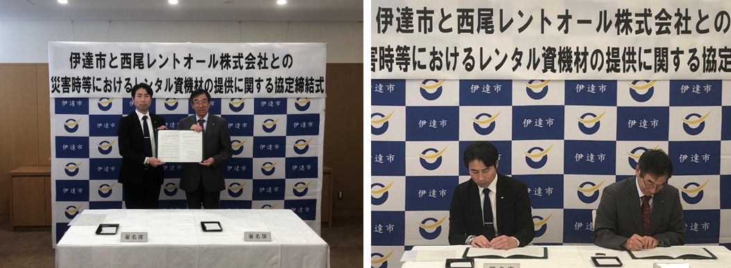 西尾レントオールは福島県伊達市と「災害時等におけるレンタル資機材の提供に関する協定」を締結しました