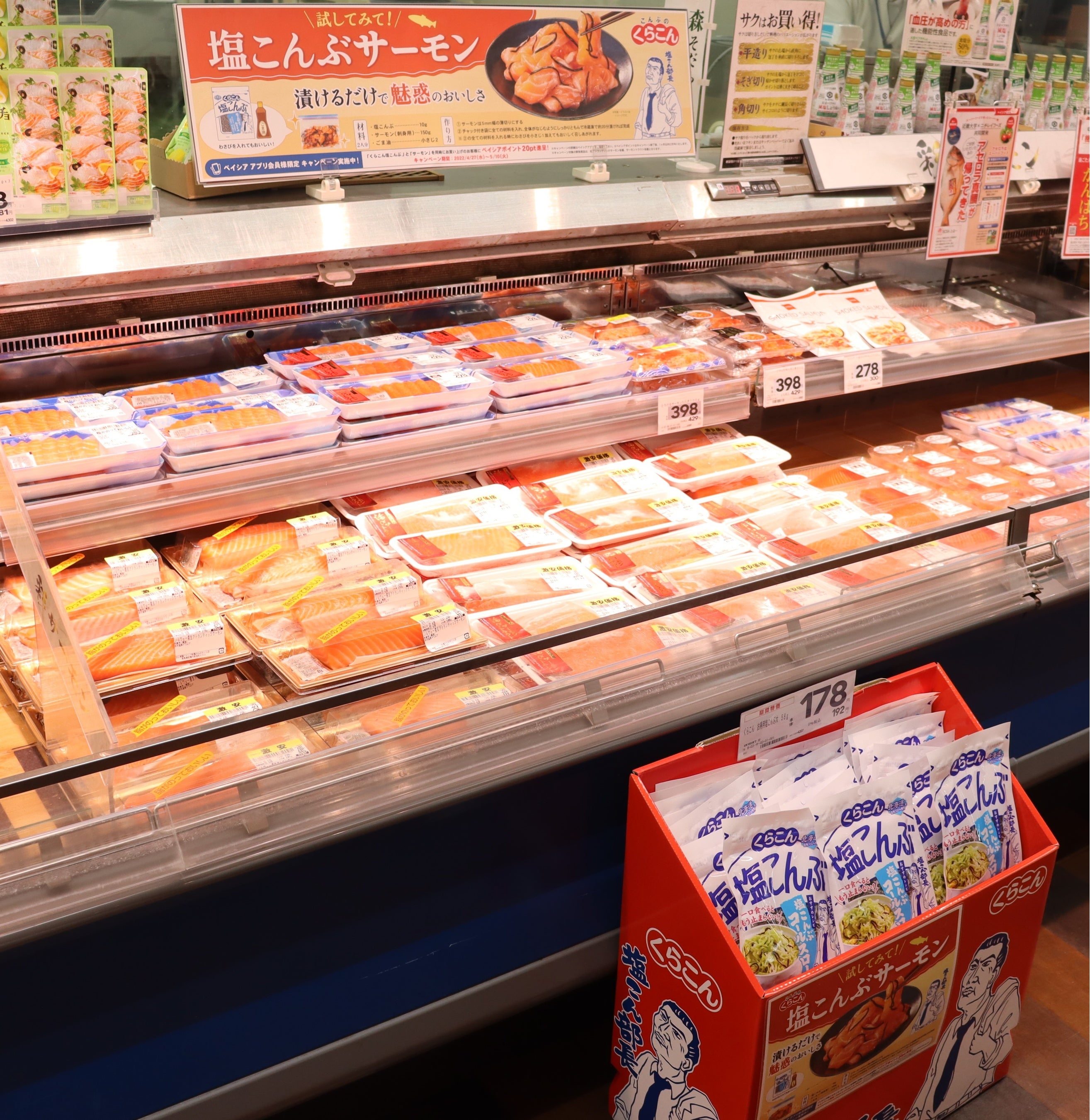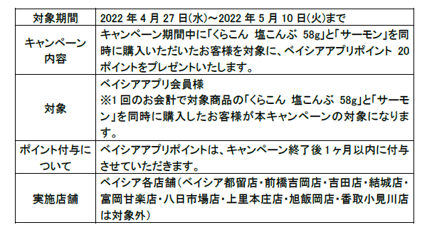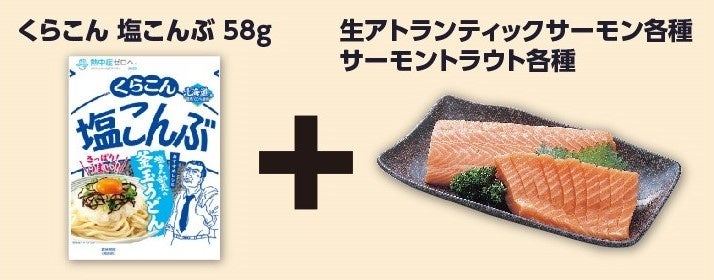 株式会社ベイシア(本社:群馬県前橋市、代表取締役社長:橋本浩英)は、4月27日(水)~5月10日(火)の期間で、ベイシアアプリ会員様限定企画として「くらこん 塩こんぶ 58g」と「サーモン」を同時購入したお客様を対象にアプリポイントをプレゼントするキャンペーンを実施いたします。キャンペーンを通して、「塩こんぶ×サーモン」のおいしさや手軽さを知っていただける売場販促やレシピ紹介も行います。ぜひ最強コラボをお試しください。