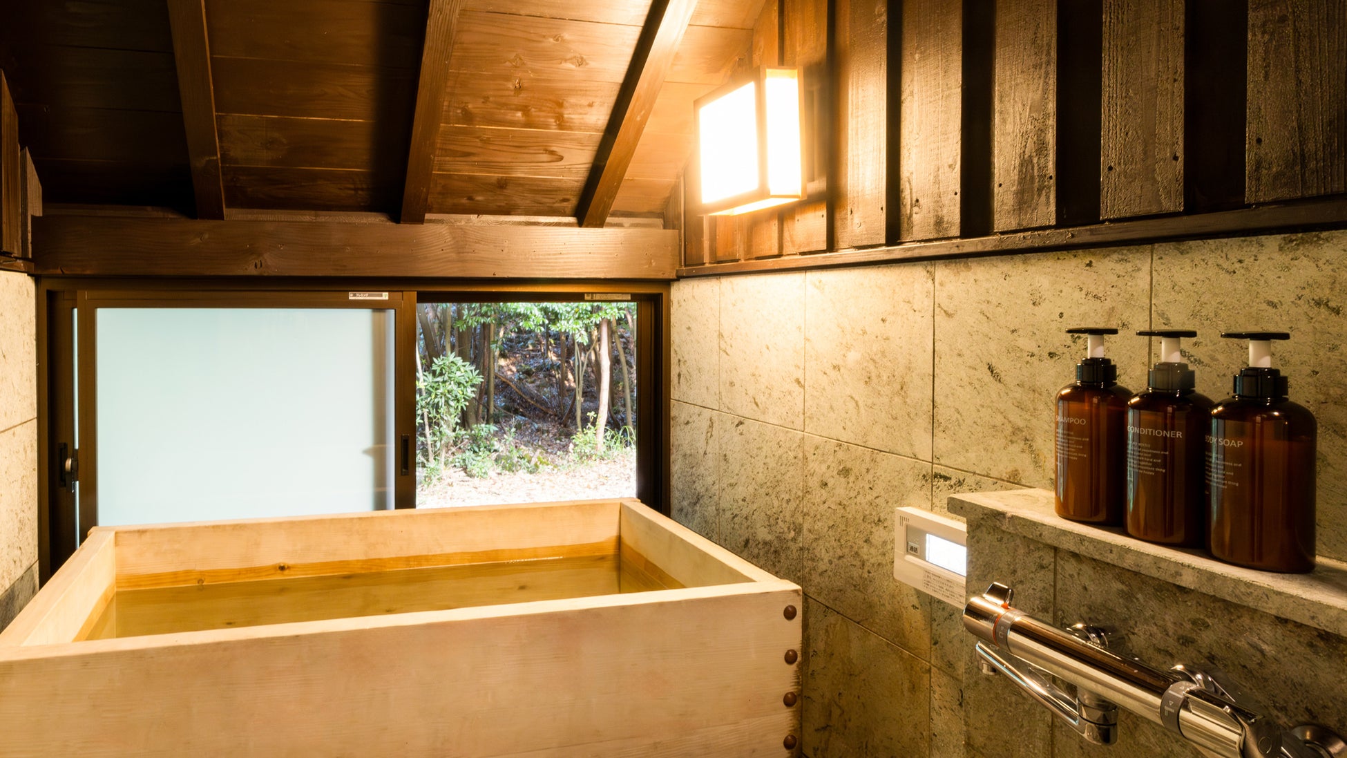 ヴィラ内のバスルームには、やさしく香り立つ檜風呂を採用。