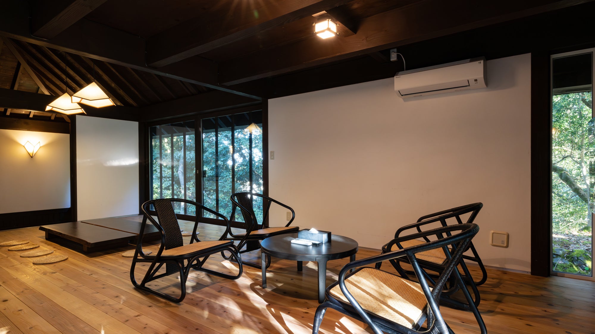 梁の重みや木の温もりを感じる古民家風の室内は、白壁と木の質感がやわらかく調和した、静かにくつろげる空間です。