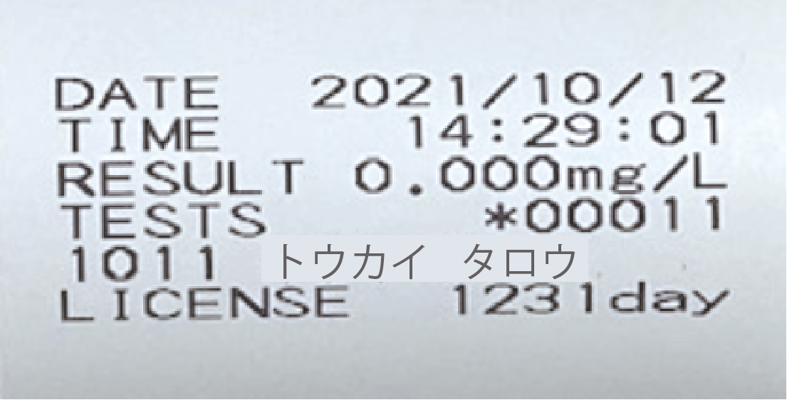 測定結果は内蔵プリンターで自動印刷!測定日時、結果、乗務員名、免許証の有効期限が印字されます。