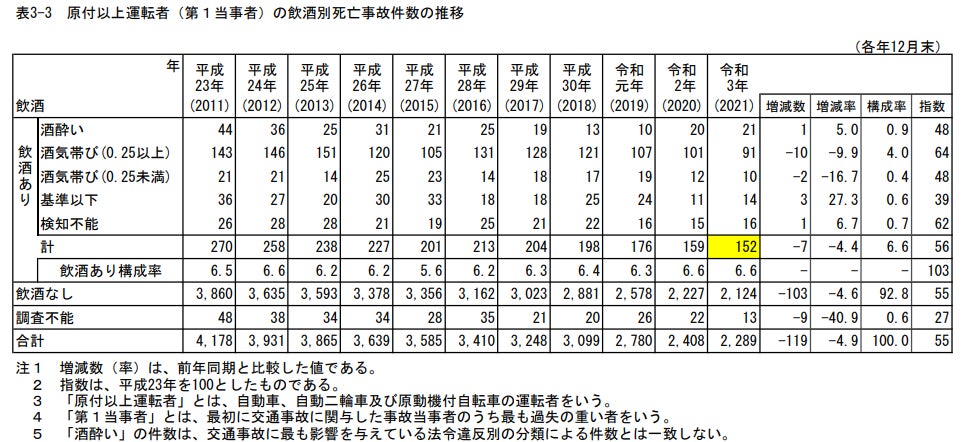 2021年6月28日、千葉県八街市で下校中の小学生5名が飲酒運転の大型トラックにはねられて2人が死亡し、3人が重傷を負いました。この惨劇があってなお、飲酒運転による死亡事故は前年より7件しか減っていないのです。