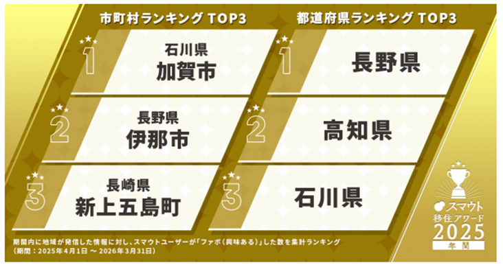 株式会社カヤックが運営する移住・関係人口促進のマッチングサービス「スマウト」に登録するユーザー約9万人の2025年度に関心が高かった人気移住先として、加賀市が第1位に選ばれました(2024年度は3位)。