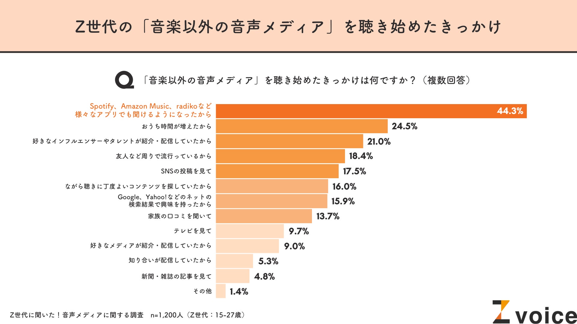 続いて、音楽以外の音声メディアを聴き始めたきっかけを聞いたところ、「Spotify、Amazon Music、radikoなど、さまざまなアプリでも聴けるようになったから」がもっとも多く、44.3%にも昇りました。