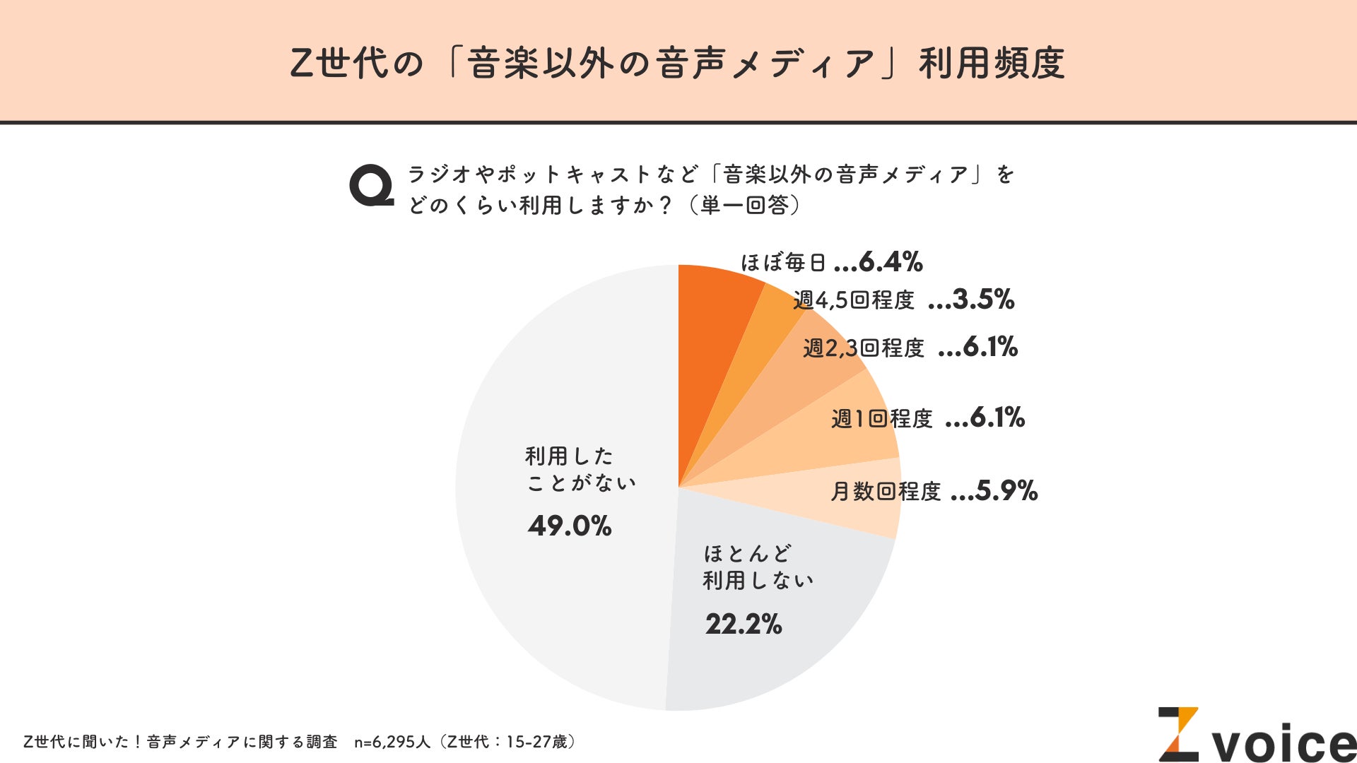 まず、Z世代6,295人を対象にラジオやポッドキャスト等の「音楽以外の音声メディア」をどのくらい利用しているかを聞いたところ、全体の28.0%が月に数回以上利用している結果に。