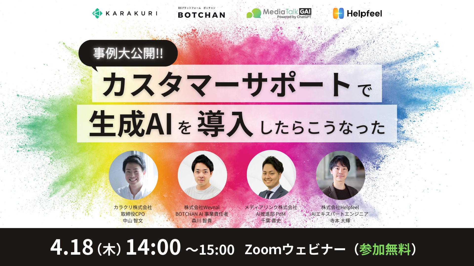 【4/18(木)14:00~】『事例大公開!カスタマーサポートで生成AIを導入したらこうなった』4社共催 無料ウェビナー開催決定!