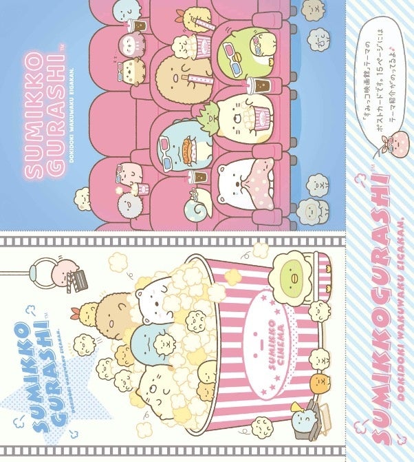 もうひとつの綴じ込み付録、ポストカードの絵柄はすみっコぐらしの最新テーマ『すみっコ映画館』。映画を見に出かけたすみっコたちが劇場の大きなスクリーンを楽しんだり、ポップコーンに埋もれる姿が可愛らしいイラストです。