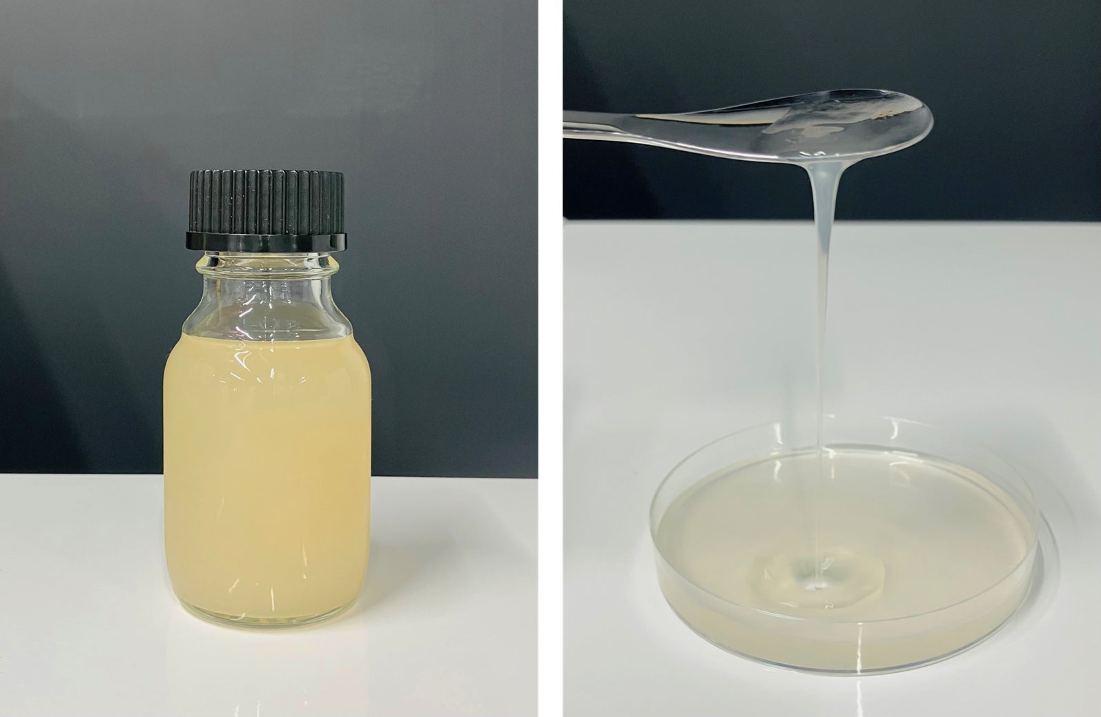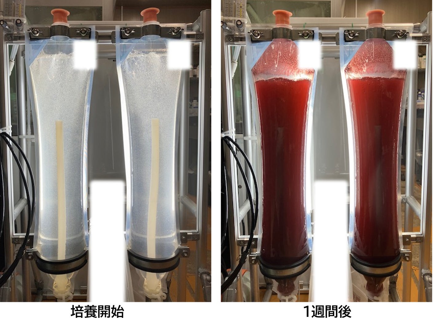 アルヌールでは、これまで微細藻類の特性を最大限に引き出す培養技術の開発を行ってまいりました。ビニールバッグの培養装置を用いた第4回目の報告となる今回は、ぬるぬるとした多糖類を分泌する微細藻類、チノリモ(ポルフィリディウムPorphyridium purpureum)の安定した高濃度培養を実現しました。チノリモは海産の単細胞紅藻であり、培養には人工海水を用いています。本種は、ごく微量の種株からでも労力をかけずに高濃度培養が可能です(図1)。増殖した赤い細胞は、窒素欠乏の状態になると時間の経過とともに培養液中に多糖類を分泌し、培養期間が進むにつれて培養液が粘性を帯びるようになります(図2、図3)。この硫酸化された多糖類は、医薬・化粧品用途などでの応用も期待されており、今後の生産技術の確立に向けた有用な成果といえます。