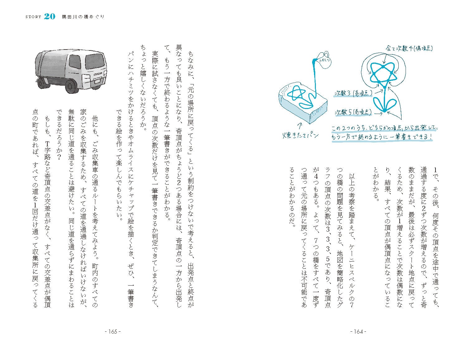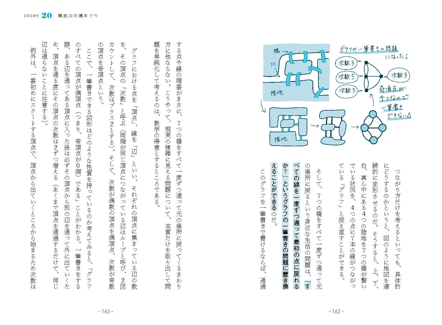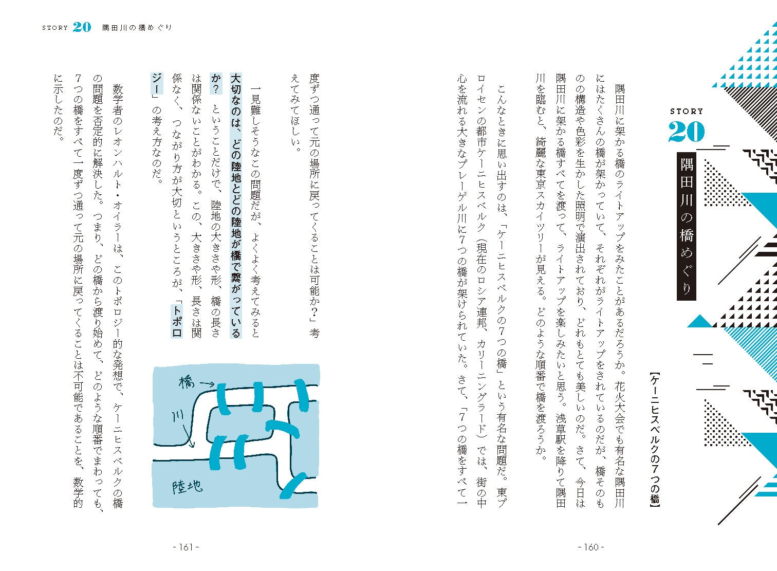 「ケーニヒスベルクの7つの橋」「トポロジー」「極小曲面」など難しそうな数学を、「隅田川の橋」や「ケーキ」「しゃぼん玉」といった身近な題材を通して、楽しみながら学ぶことができる一冊です。