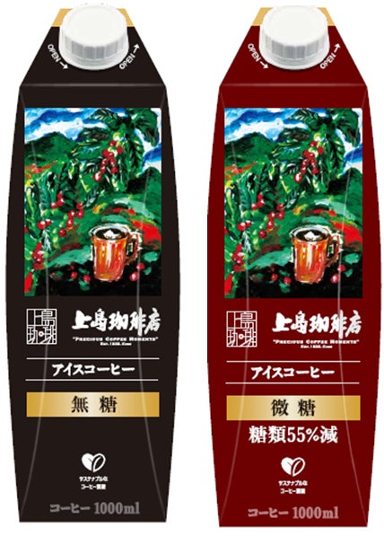 このたびUCCは、より幅広いお客さまに、ショップブランドならではの「こだわり」、「本物」、「上質」なコーヒーの価値・世界観を提供したいという思いから、紙パック製品の製品化を実現しました。紙パック製品『上島珈琲店 アイスコーヒー 無糖/微糖 1000ml』は、厳選されたアラビカ豆100%を贅沢に使用し、コーヒー豆のおいしさを余すことなくネルドリップ抽出したこだわりの一杯です。無糖はストレート飲用に最適な、フルーティでコクのある上質な味わい、微糖※1はコク深くフルーティな味わいにほどよい甘みを加えており、ミルク割りでもお楽しみいただけます。また、UCCグループの「サステナブルなコーヒー調達※2」の基準を満たしたコーヒー豆を50%以上使用しています。