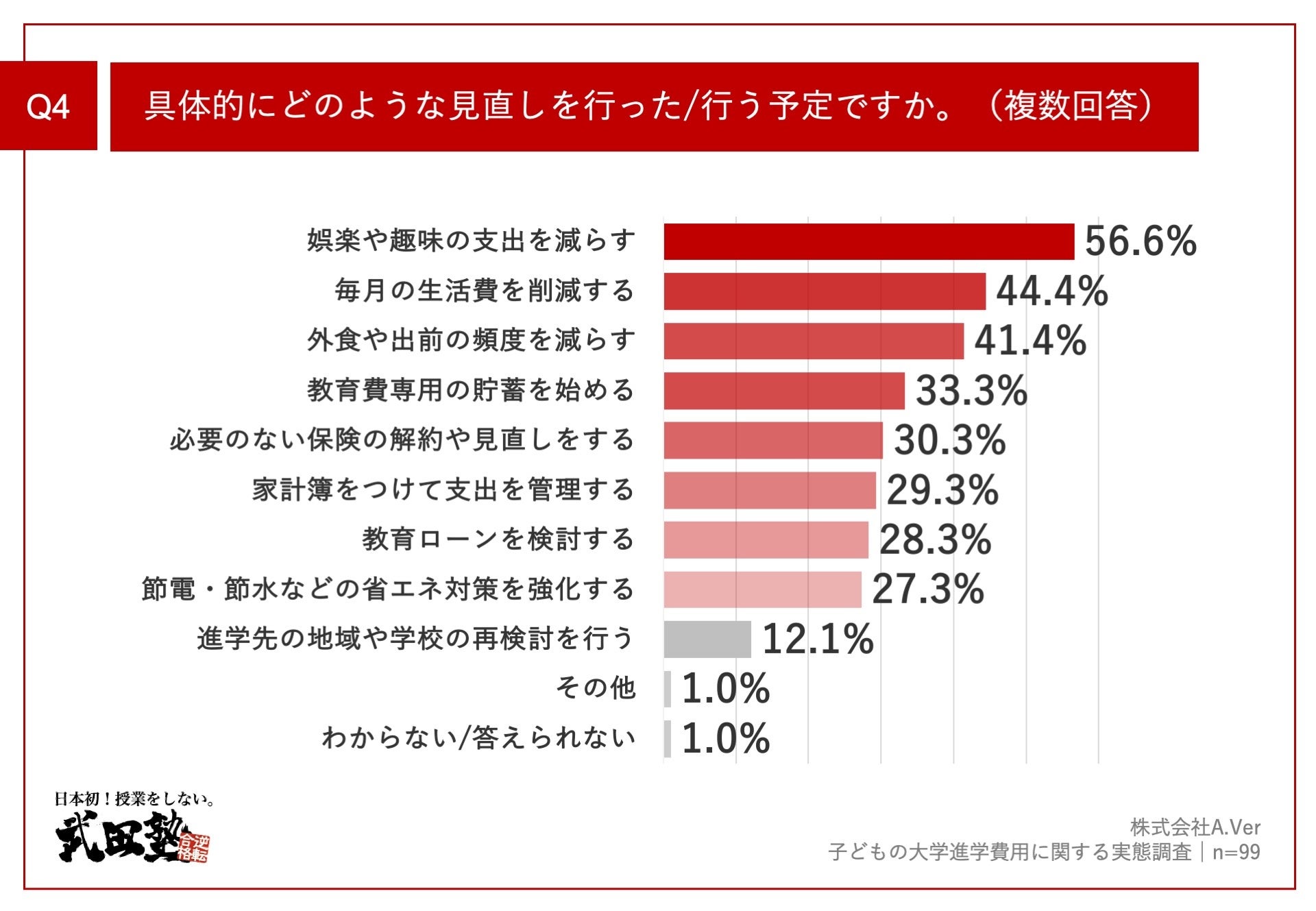 Q3で「すでに見直しを行った」「現在見直しを行っている」「今後見直す予定」と回答した方に、「Q4.具体的にどのような見直しを行った/行う予定ですか。(複数回答)」(n=99)と質問したところ、「娯楽や趣味の支出を減らす」が56.6%、「毎月の生活費を削減する」が44.4%、「外食や出前の頻度を減らす」が41.4%という回答となりました。