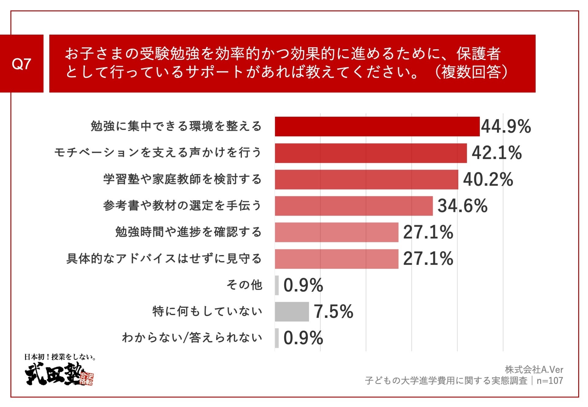 「Q7.お子さまの受験勉強を効率的かつ効果的に進めるために、保護者として行っているサポートがあれば教えてください。(複数回答)」(n=107)と質問したところ、「勉強に集中できる環境を整える」が44.9%、「モチベーションを支える声かけを行う」が42.1%、「学習塾や家庭教師を検討する」が40.2%という回答となりました。
