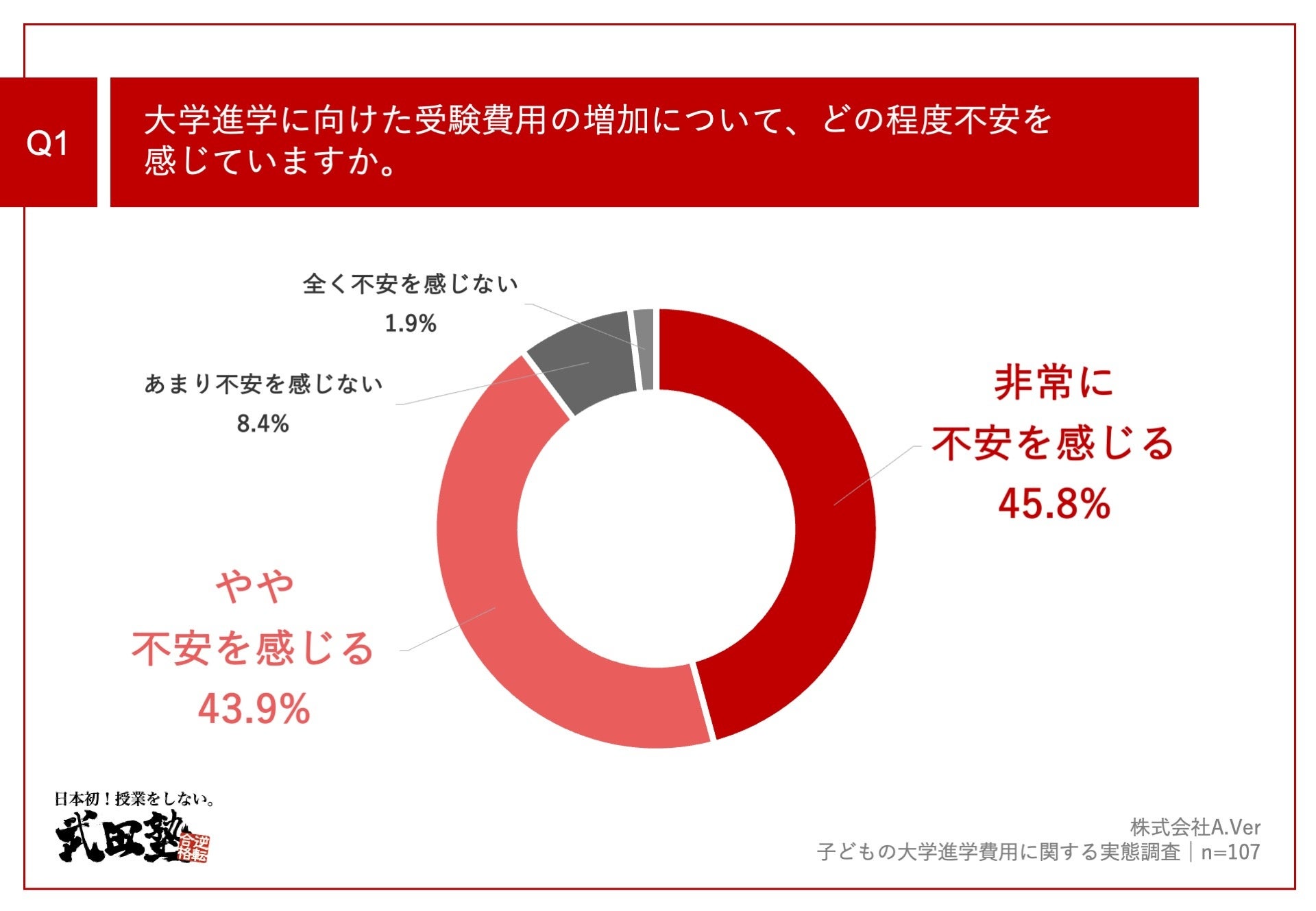 「Q1.大学進学に向けた受験費用の増加について、どの程度不安を感じていますか。」(n=107)と質問したところ、「非常に不安を感じる」が45.8%、「やや不安を感じる」が43.9%という回答となりました。