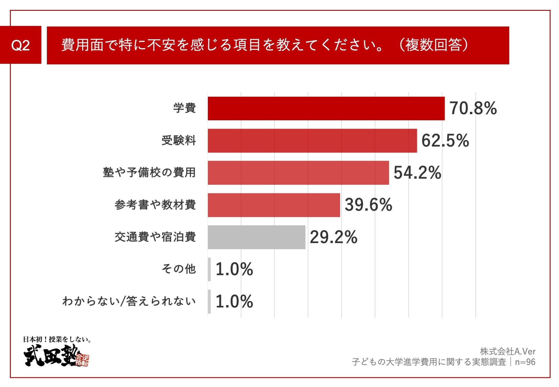 Q1で「非常に不安を感じる」「やや不安を感じる」と回答した方に、「Q2.費用面で特に不安を感じる項目を教えてください。(複数回答)」(n=96)と質問したところ、「学費」が70.8%、「受験料」が62.5%、「塾や予備校の費用」が54.2%という回答となりました。