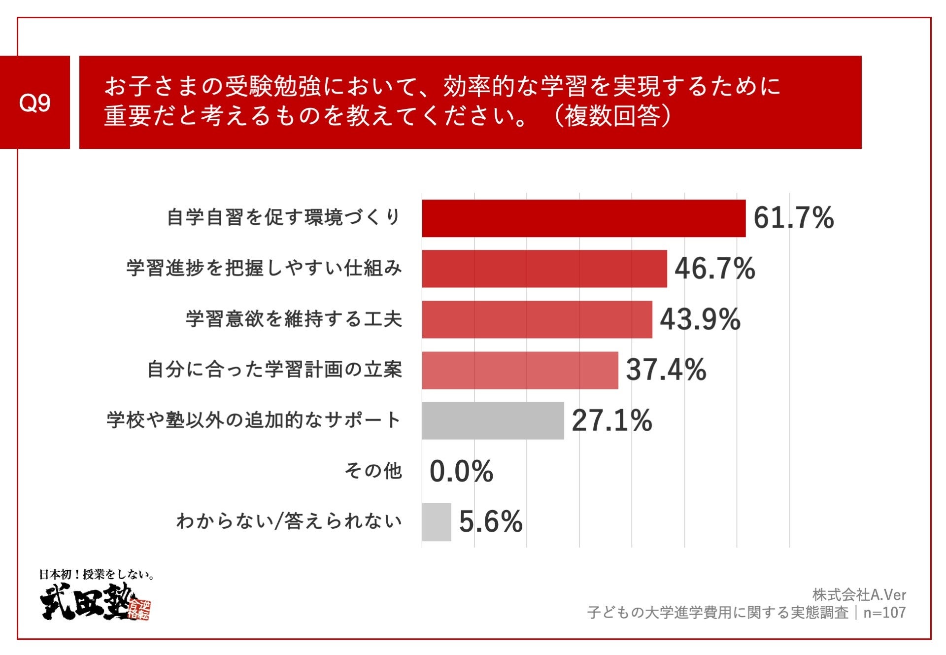 「Q9.お子さまの受験勉強において、効率的な学習を実現するために重要だと考えるものを教えてください。(複数回答)」(n=107)と質問したところ、「自学自習を促す環境づくり」が61.7%、「学習進捗を把握しやすい仕組み」が46.7%、「学習意欲を維持する工夫」が43.9%という回答となりました。