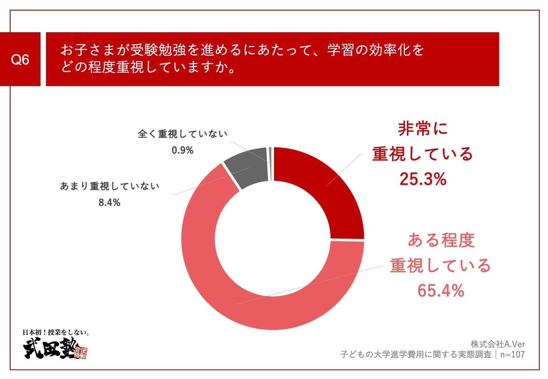 「Q6.お子さまが受験勉強を進めるにあたって、学習の効率化をどの程度重視していますか。」(n=107)と質問したところ、「非常に重視している」が25.3%、「ある程度重視している」が65.4%という回答となりました。