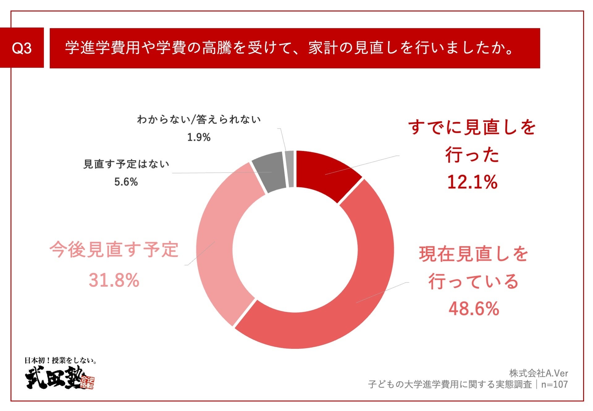 「Q3.大学進学費用や学費の高騰を受けて、家計の見直しを行いましたか。」(n=107)と質問したところ、「すでに見直しを行った」が12.1%、「現在見直しを行っている」が48.6%という回答となりました。