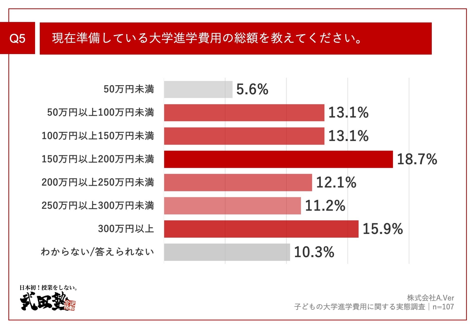 「Q5.現在準備している大学進学費用の総額を教えてください。」(n=107)と質問したところ、「150万円以上200万円未満」が18.7%、「300万円以上」が15.9%という回答となりました。
