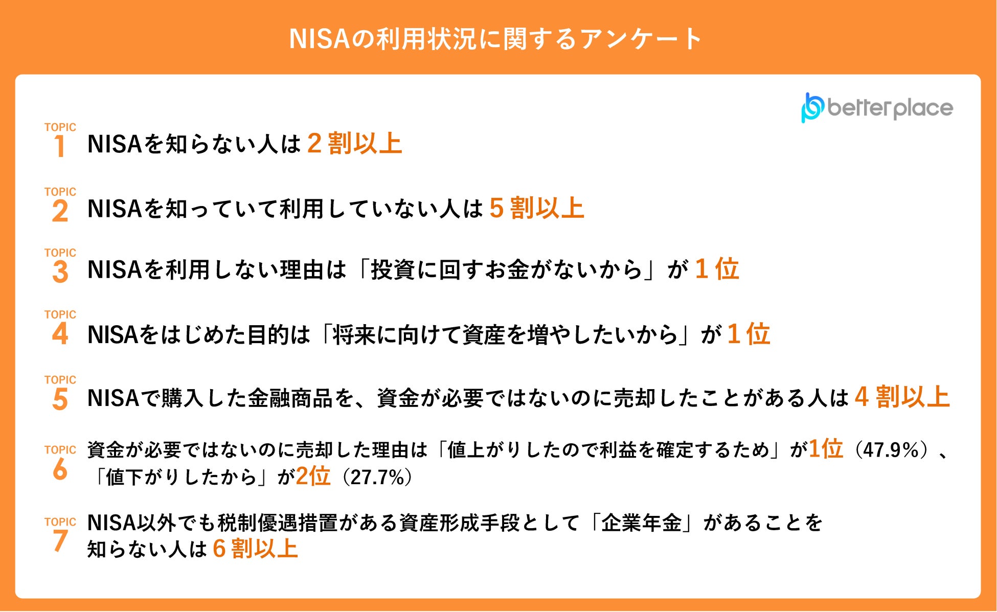 「福祉はぐくみ企業年金基金」(以下、「はぐくみ企業年金」)を中心に、企業年金・退職金制度の導入・設計をサポートする株式会社ベター・プレイス(本社:東京都新宿区、代表取締役社長:森本 新士、https://bpcom.jp/、以下、ベター・プレイス)は、2024年12月に全国20~50代の男女を対象に「NISAの利用状況に関するアンケート」を実施いたしました。