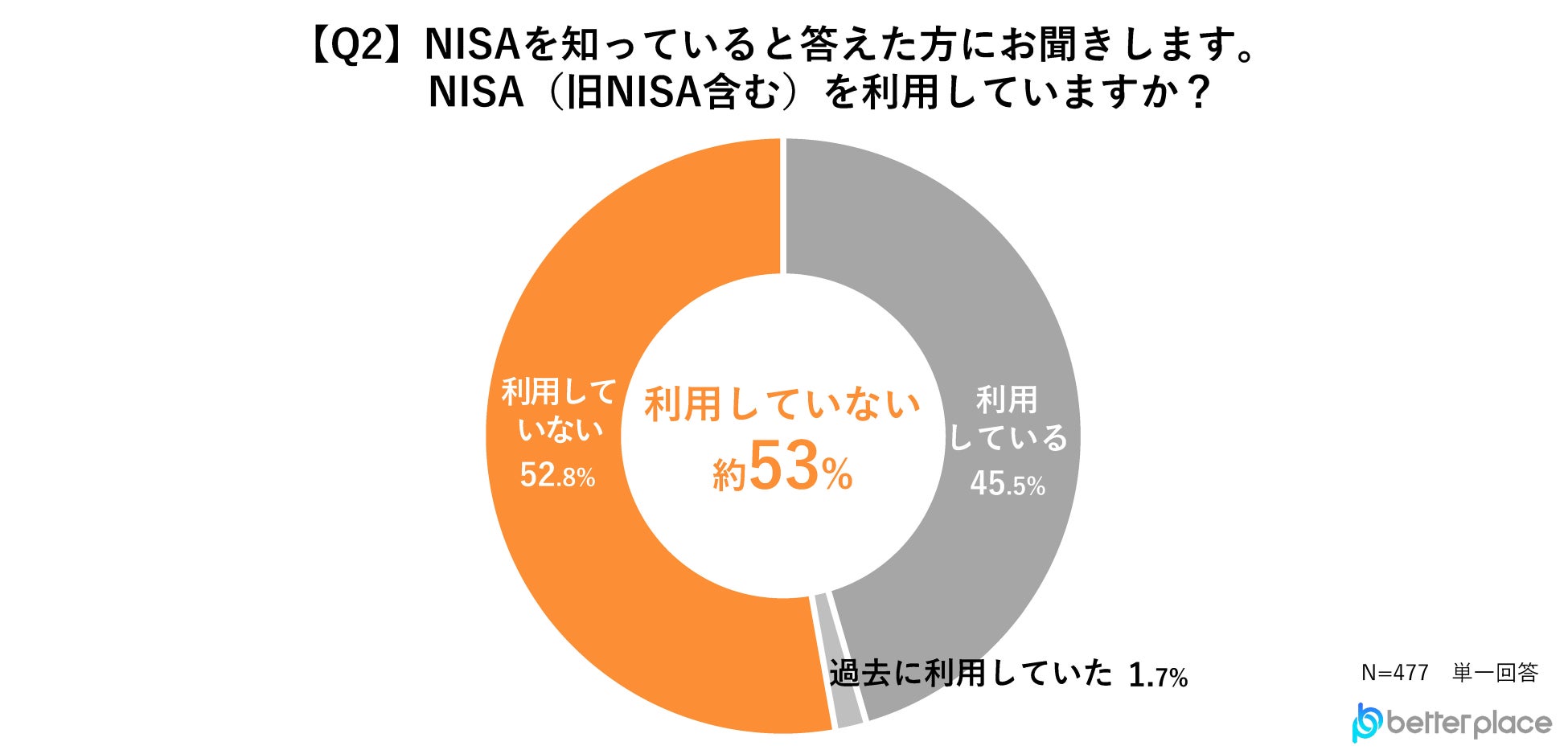 NISAを知っている人に利用状況を聞いたところ、利用していると答えた人は45.5%、利用していないと答えた人は52.8%と、半数以上の人がNISAを利用していないことがわかりました。