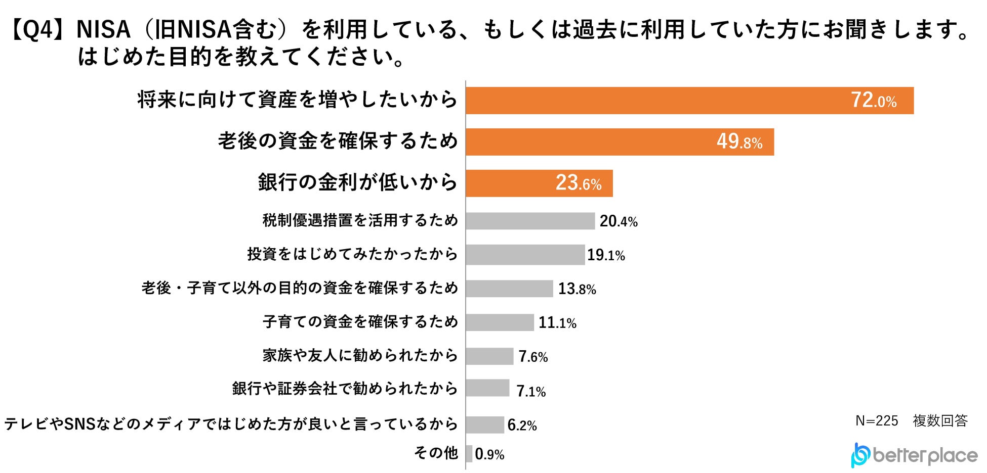 NISAをはじめた理由は、「将来に向けて資産を増やしたいから」が72.0%と最も多く、次いで「老後の資金を確保するため」が49.8%、「銀行の金利が低いから」が23.6%という結果になりました。