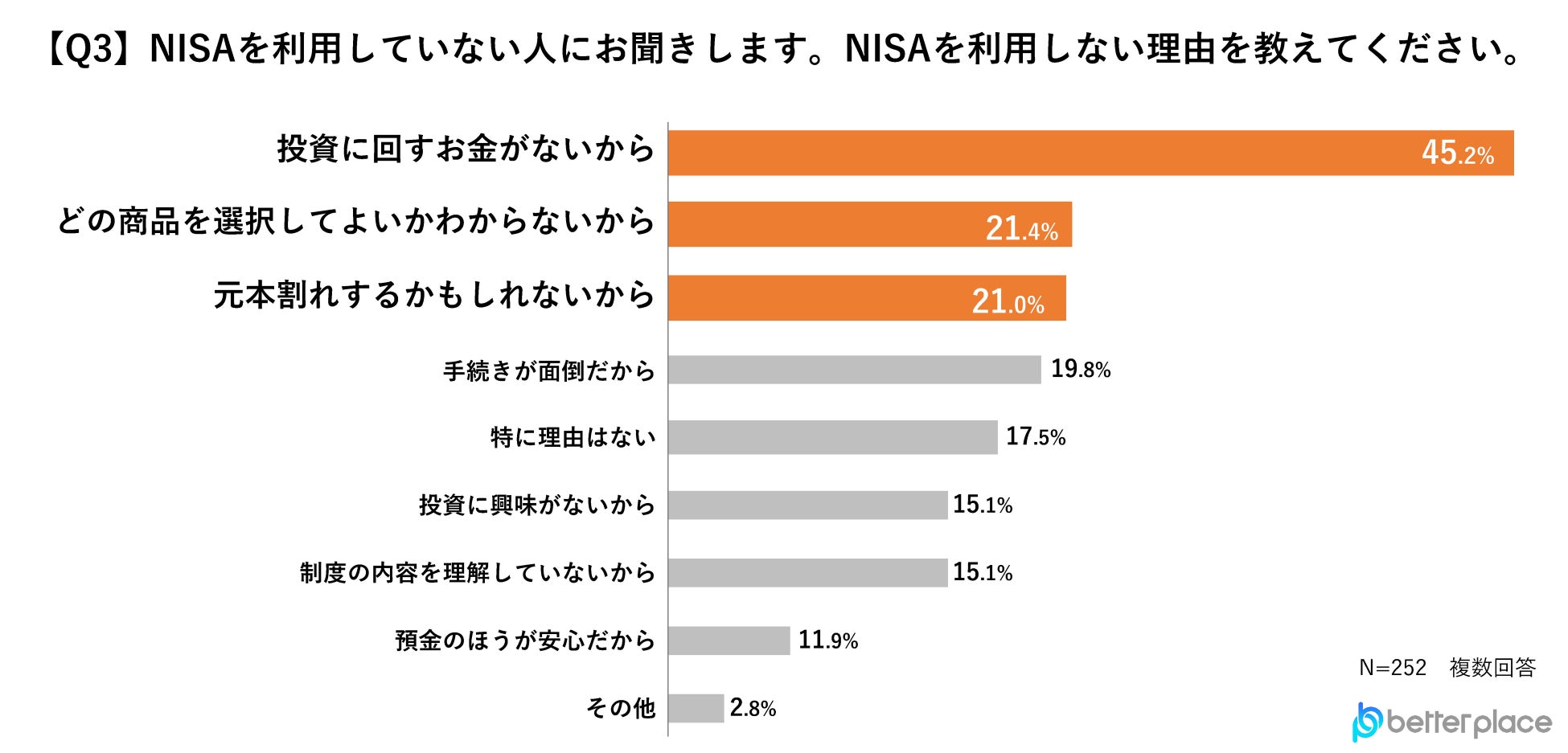 NISAを知っていて利用していない人に、利用しない理由を聞いたところ、「投資に回すお金がないから」が45.2%と最も多く、次いで「どの商品を選択してよいかわからないから」が21.4%、「元本割れするかもしれないから」が21.0%と続きました。