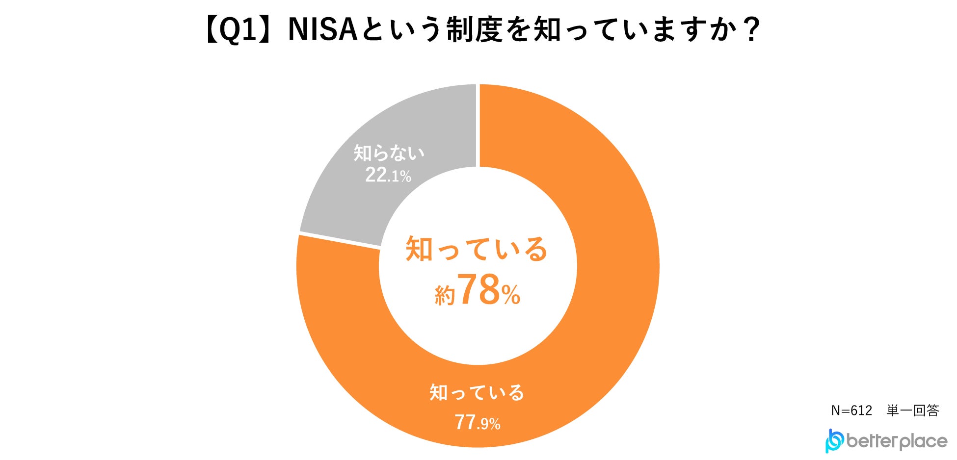 NISAの認知度を調査したところ、知っていると答えた人は77.9%、知らないと答えた人は22.1%と2割以上の人がNISAを知らないことがわかりました。
