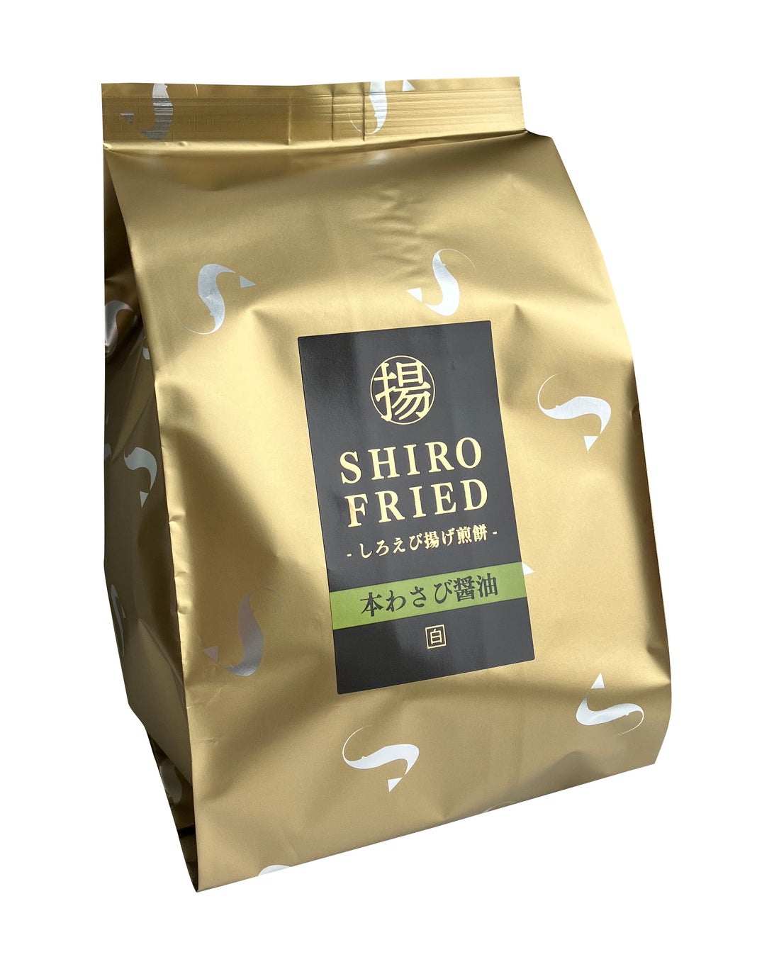 「ちょっと贅沢なFRIEDおやつ」がテーマのしろえび揚げ煎餅。富山湾の宝石と呼ばれる「しろえび」を練り込んだ富山県産米100%の生地を日の出屋製菓産業独自のブレンド油で手揚げしています。