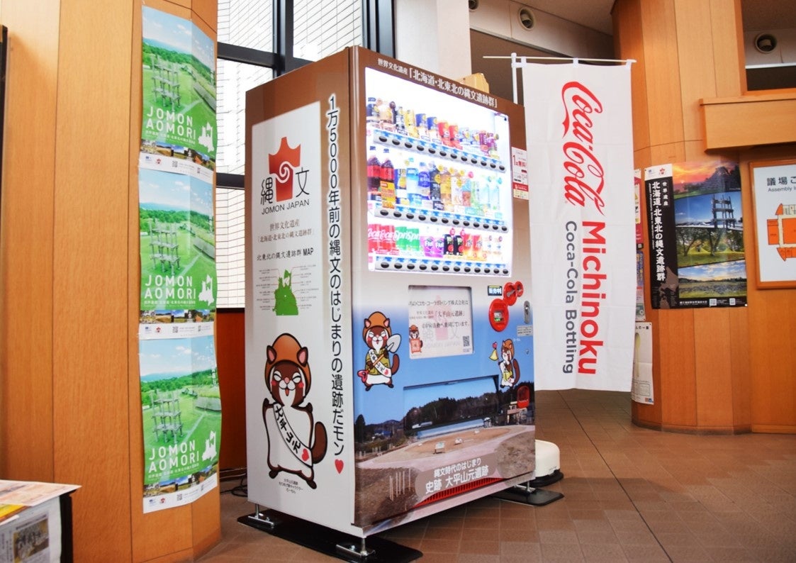 また、この協定に基づき、「北海道・北東北の縄文遺跡群」PR自動販売機(以下「縄文PR自販機)を、外ヶ浜町役場1階 エントランスに設置いたしました。縄文PR自販機は、外ヶ浜町では初めての設置となり、「大平山元遺跡」と、同遺跡もりあげたいキャラクター「むーもん」をデザインしたラッピングを施し、市民や遺跡来訪者に対する機運醸成を広く図ります。なお、縄文遺跡群は、北海道に6つ、青森県に8つ、岩手県に1つ、秋田県に2つあり、北東北を事業エリアとする当社は、縄文PR自販機にその地域ならではのデザインをあしらいながら設置を増やすことで、観光客の回遊を促し地域経済への貢献を狙います。