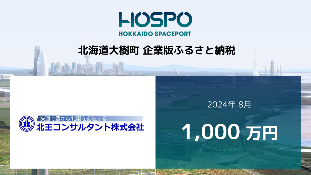 民間にひらかれた商業宇宙港「北海道スペースポート(HOSPO) 」を運営する北海道大樹町(町長:黒川豊)とSPACE COTAN株式会社(本社:北海道広尾郡大樹町、代表取締役社長兼CEO:小田切義憲)はこの度、北王コンサルタント株式会社(本社:北海道帯広市、代表取締役:石川健司)より、HOSPOプロジェクトの資金として、1,000万円の企業版ふるさと納税の寄附をいただいたことをお知らせいたします。