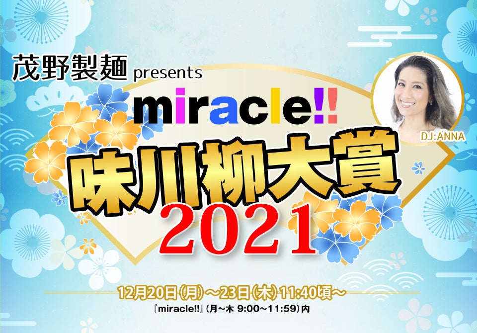 毎週月曜日から木曜日朝9時から放送中の『miracle!!』。年末恒例の「茂野製麺 presents miracle!! 味川柳大賞2021!!」が開催中です!2021年も残すところわずか!あなたの2021年を振り返って、川柳(五・七・五の十七音)にしてみませんか?ハッピーだったこと、残念だったこと、印象に残っている出来事…テーマはなんでもOK!味のある作品を送ってくれた方に、素敵な美味しいプレゼントをお送りします!