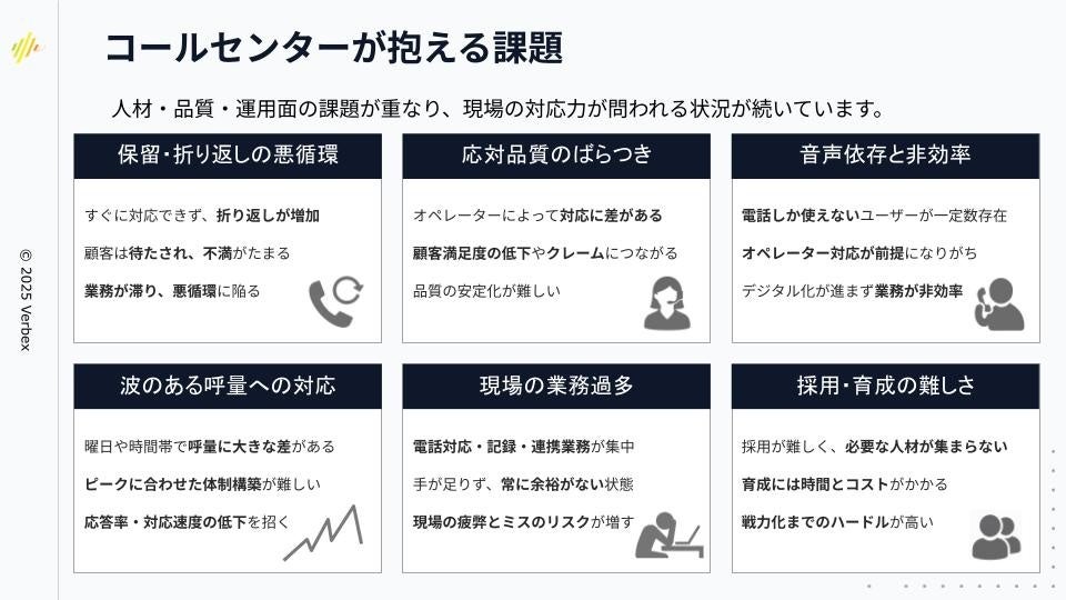 これにより、コールセンターが抱える人材不足・応対品質のばらつき・折り返し発生・業務過多・採用育成コスト増大などの課題解消に貢献します。