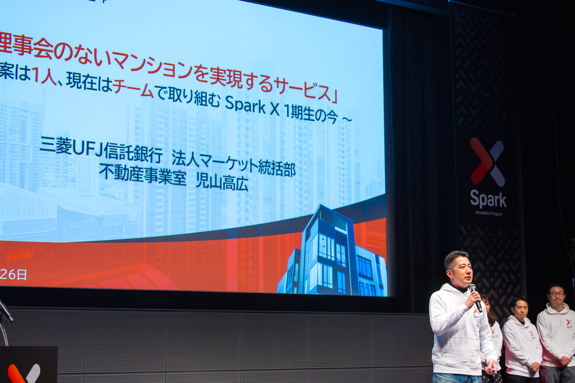 Awardには、2022・2023年度の受賞チームも登壇。密着動画やプレゼンを通じて、外部企業へ出向してのビジネスモデル検証、銀行店舗を利用しての事業検証、関係部署を巻き込んだ与信モデル策定など、各チームが事業開発責任者として試行錯誤を繰り返しながら多様な活動に取り組んでいることが報告されました。こうした取り組みを経て、2022年に特別賞を受賞した案件「理事会のないマンション管理組合」を実現する“~PROTHIRD~”が、2024年6月にSparkX初の本格事業立上げ(※)に至り、会場を大いに湧かせました。「想いを形に、挑戦を実践する場がある」というSpark Xのコンセプトが改めて証明されました。