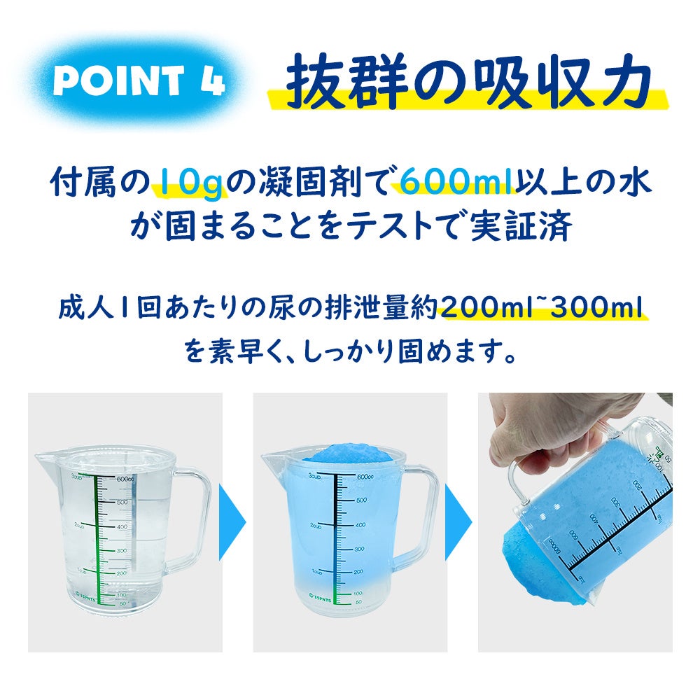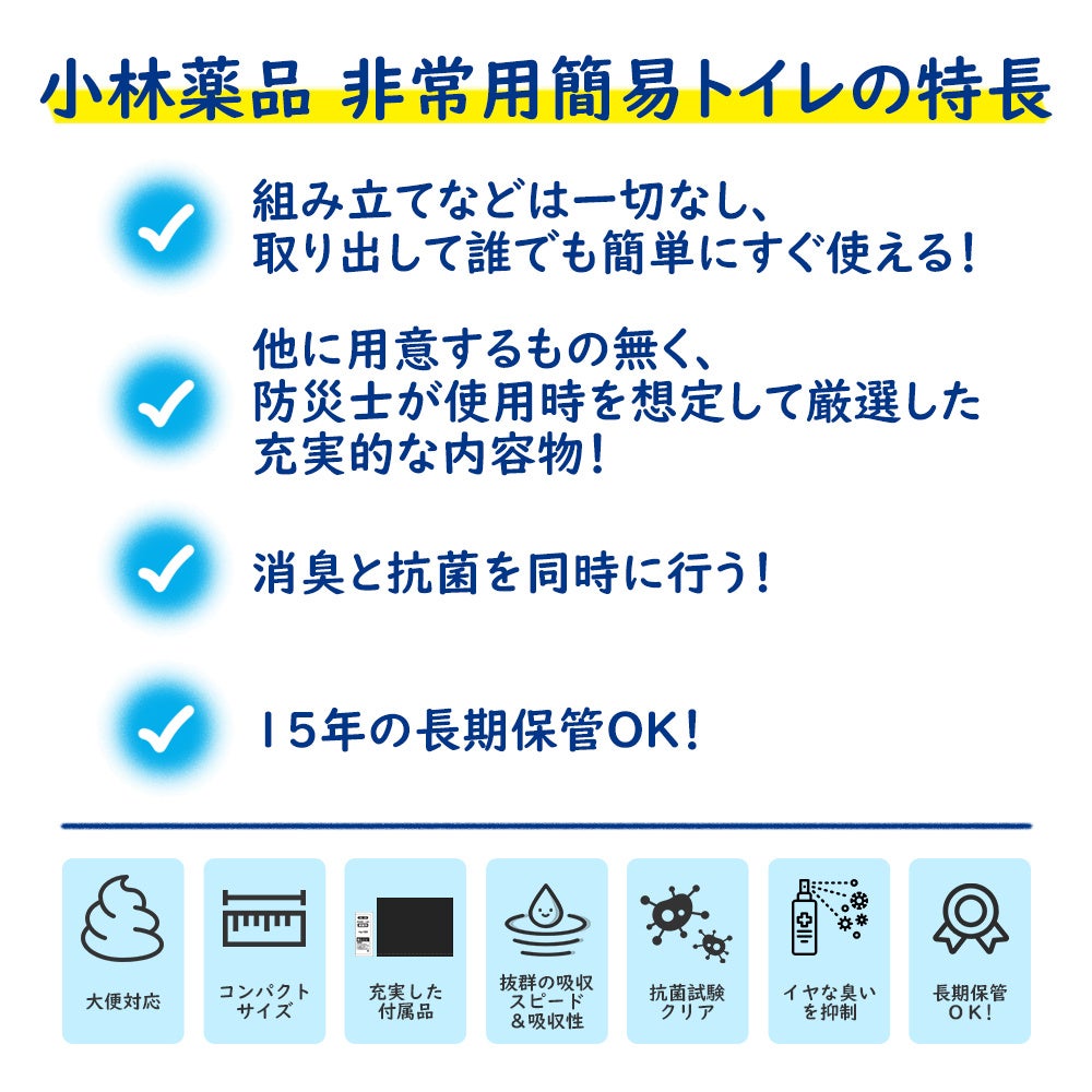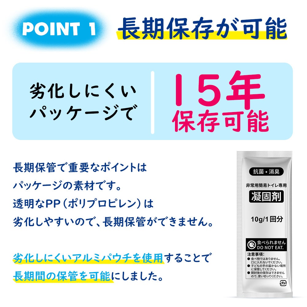 組み立ての必要がなく、すぐに使える簡易トイレです。15年の長期保管が可能!日本国内での消臭・抗菌試験にも合格した凝固剤を採用しているため、清潔にお使いいただけます。