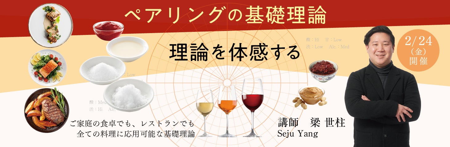 ワインエナジー株式会社が運営するヴィノテラスが、【ペアリングの基礎講座】を開催。世界のベストソムリエ50に選ばれた講師梁 世柱が、業界随一のペアリング理論とテクニックを徹底解説!