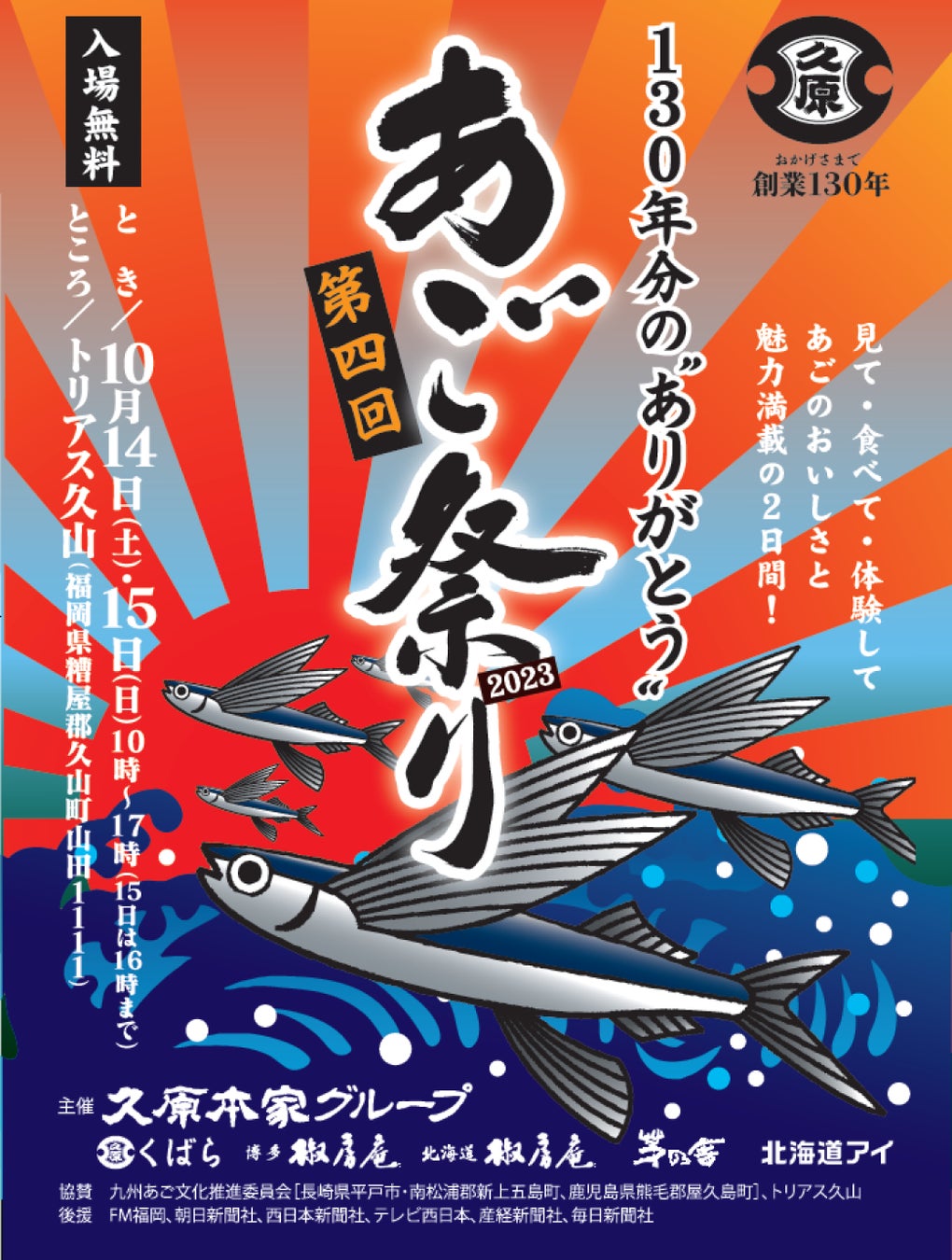 久原本家グループ主催「第4回 あご祭り2023」 10/14(土)・15(日)、「トリアス久山」にて開催!~あご(トビウオ)のおいしさと魅力満載の屋外フードイベント~